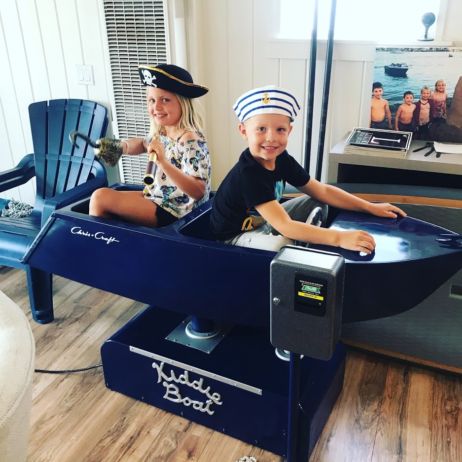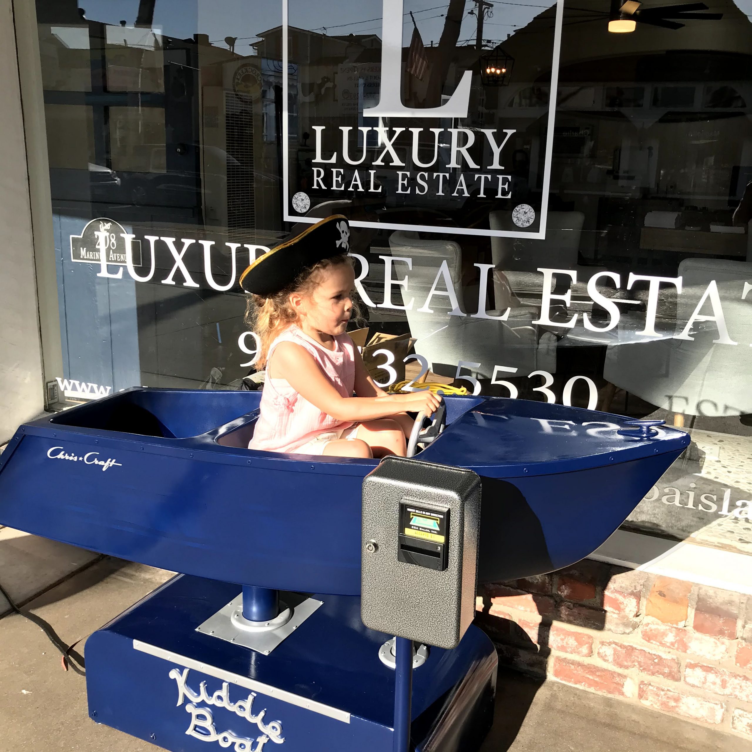 The original boat was pretty rad, but we had some issues. It was setup on the original quarter coin mechanism and the timer was broke. You could pay a quarter for an endless ride. Luckily the Kiddie Ride company and Coin Mech, Inc. are still in business! They provide new rides and updated parts for older rides. The Kiddie boat was taken to The Tint Pros shop on Newport Blvd for refurbishing. Ideal timing since tint was not an essential business. Greg and I tinkered with the quarter box timer for a while and I almost electrocuted myself. We do have that on video! I know enough to make smart guestimates, but am not a licensed electrician! We called it a day and did some googling later. I found an updated $ bill box acceptor where you could set a custom ride/vend time. Banks are a pain with quarters and most people have a buck on them rather than quarters, so we made the investment! $500 upgrade. While we waited for it to arrive, we took apart the entire ride, bought new hardware, sanded down the rust, paint, etc. and painted the pieces together as a family to a more Luxury Real Estate look! We wanted Navy Blue, Chris Craft, Silver, Chrome, American Flag, Cool Boat Name, etc. It was coming together piece by piece, just in time for Memorial Day Weekend!